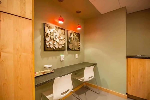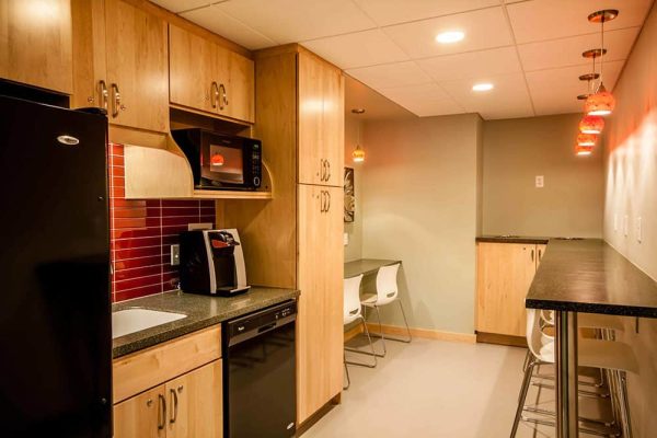 The goal of this project was to improve the look, finish, and even the atmosphere of this kitchen. With the addition of a high-counter sitting area, improved lighting quality, and a lower, private sitting area, this space has gone from a kitchen/storage area to a cozy break room fit for anyone. There are wall outlets at every seat to allow for the charging of laptops and smartphones while on break.
