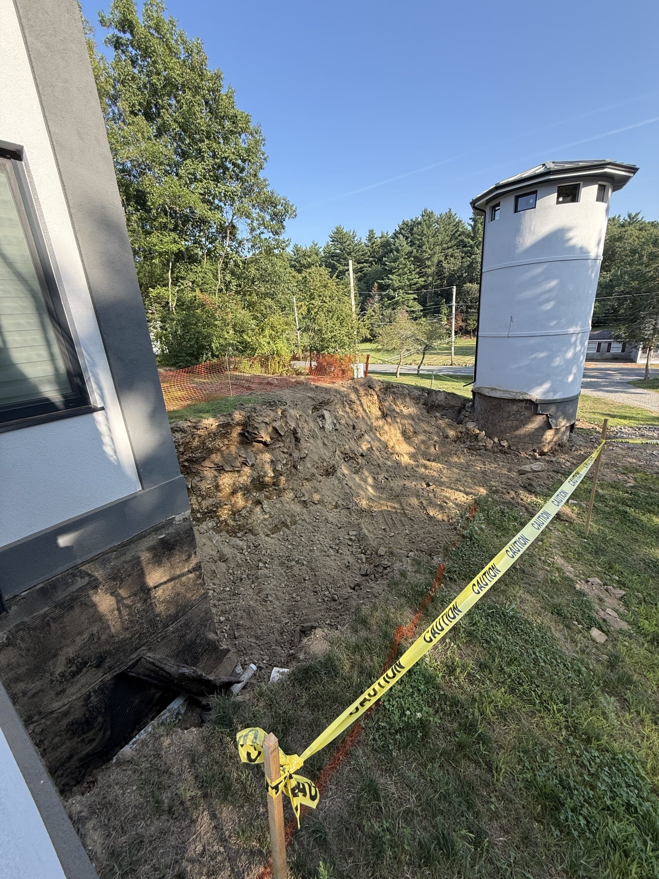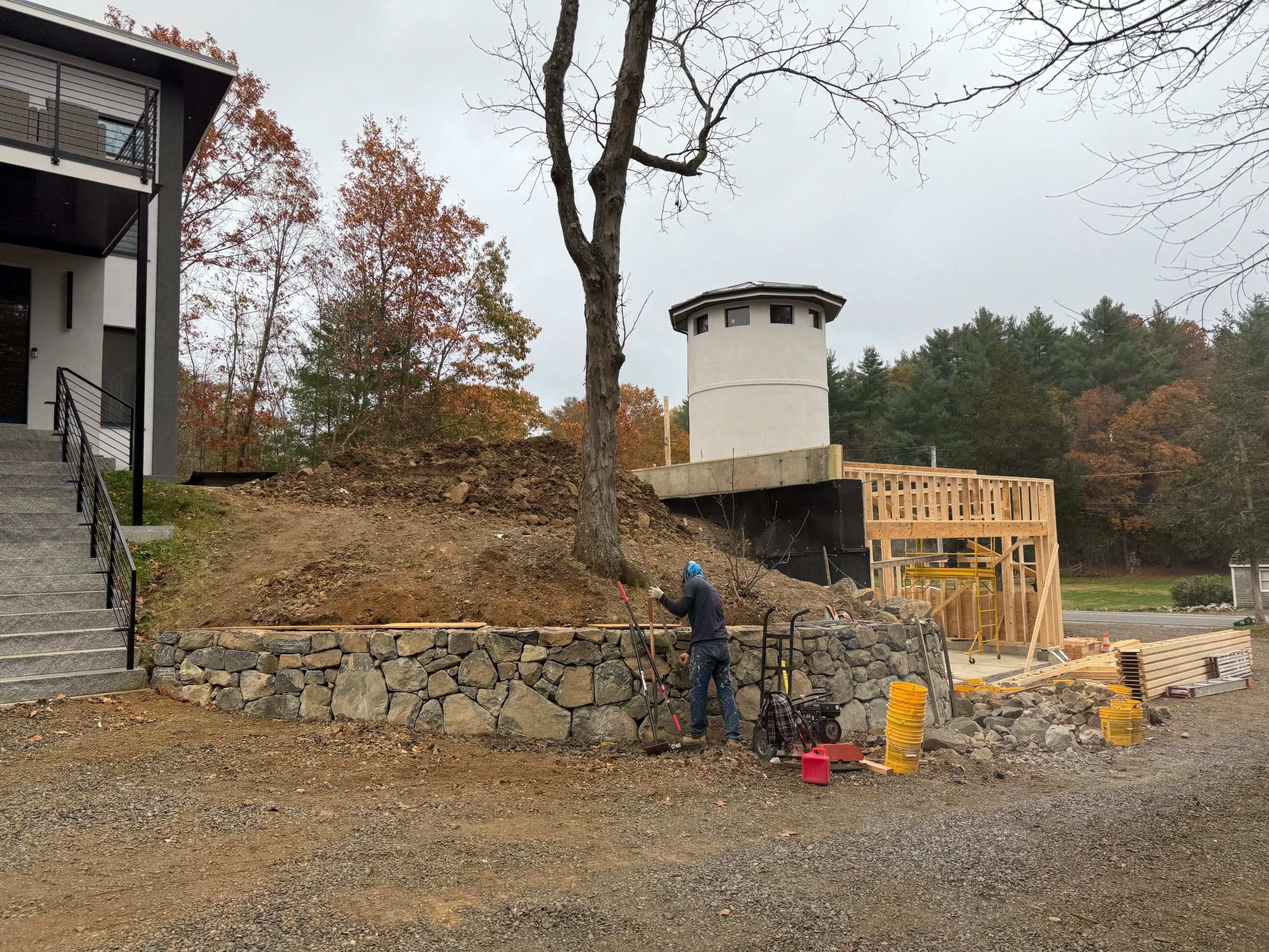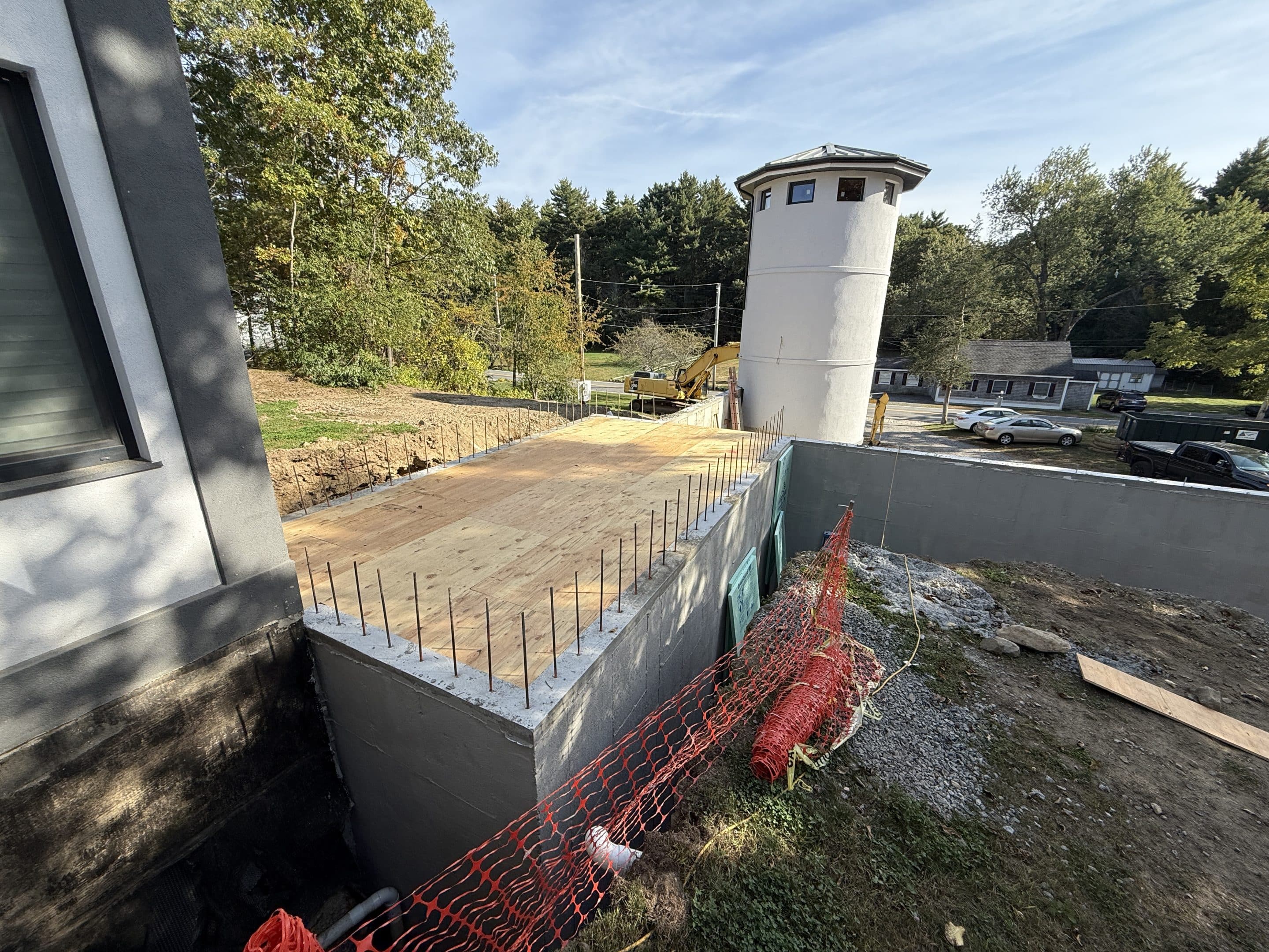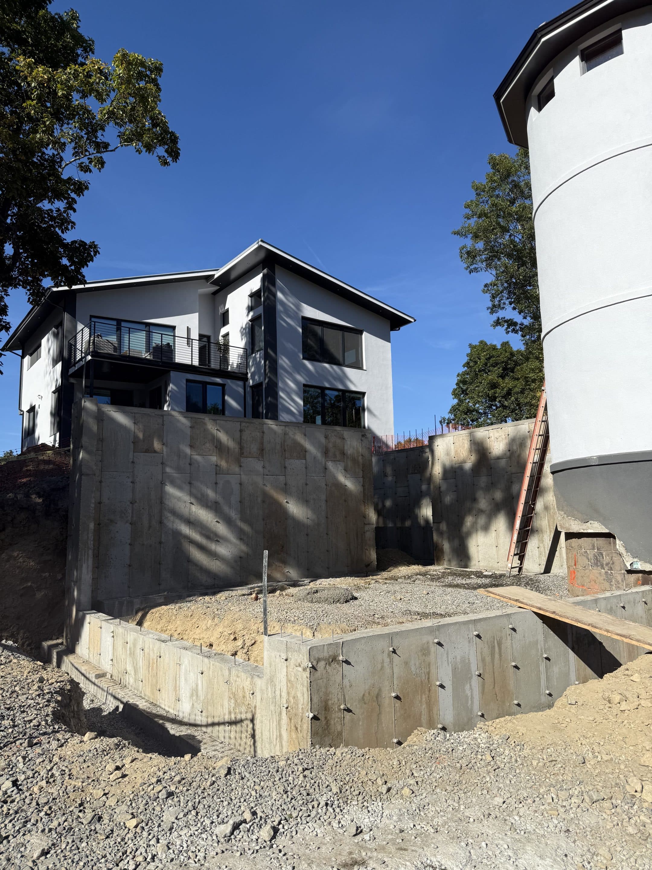 Designing and constructing the tunnel presented unique challenges due to the steep hill at the front of the property. Excavating the slope required precision to ensure stability while creating enough space for the tunnel, bathroom, and garage. An excavation team was hired to carefully dig into the hill, after which the foundation was poured and the framing completed. The project has now moved into the waterproofing phase on the tunnel roof to ensure long term durability.