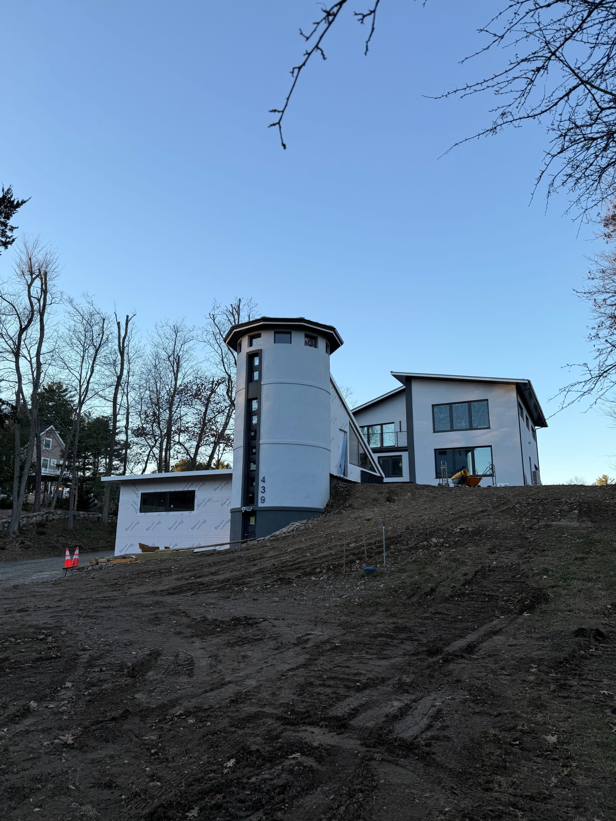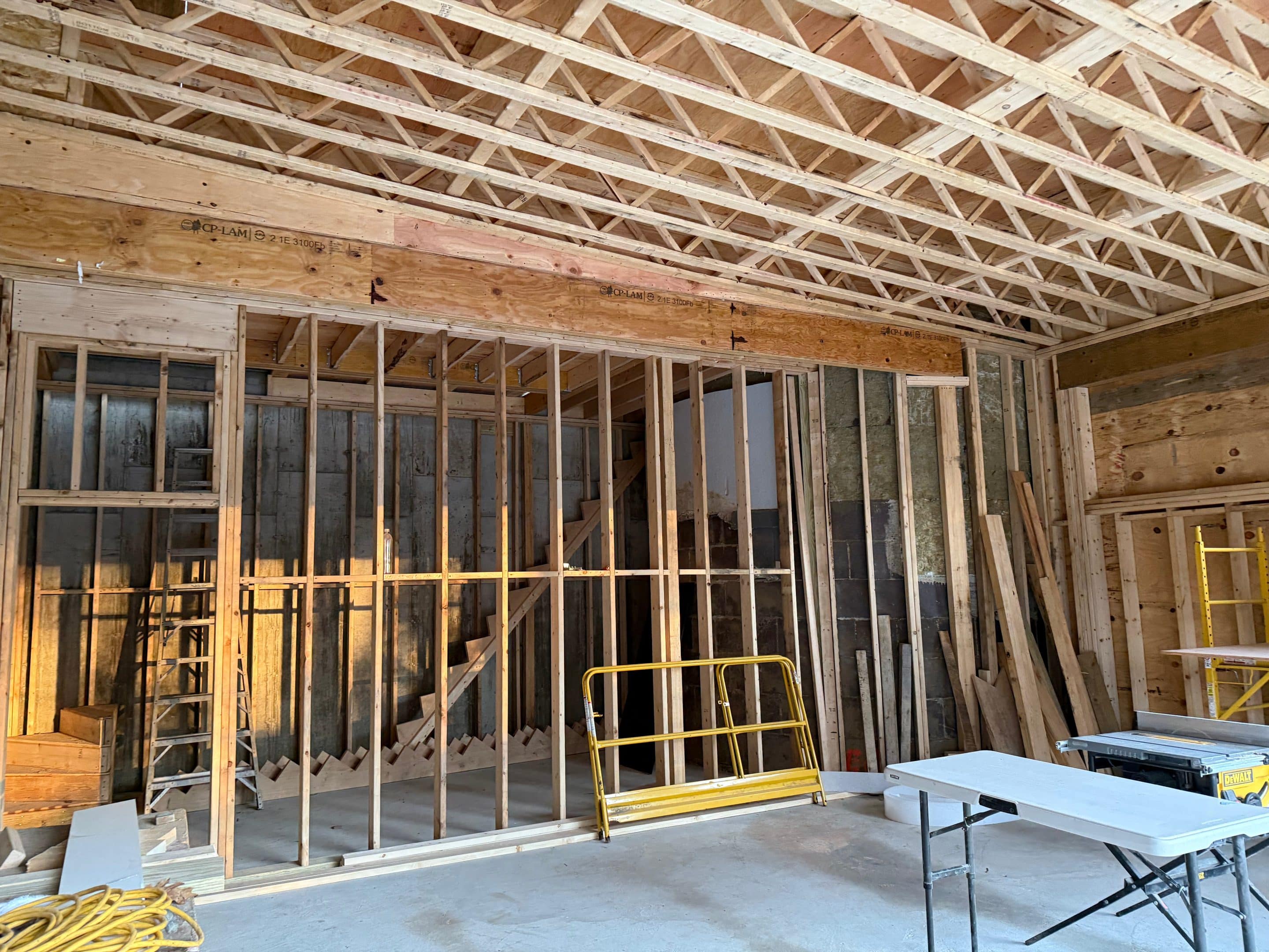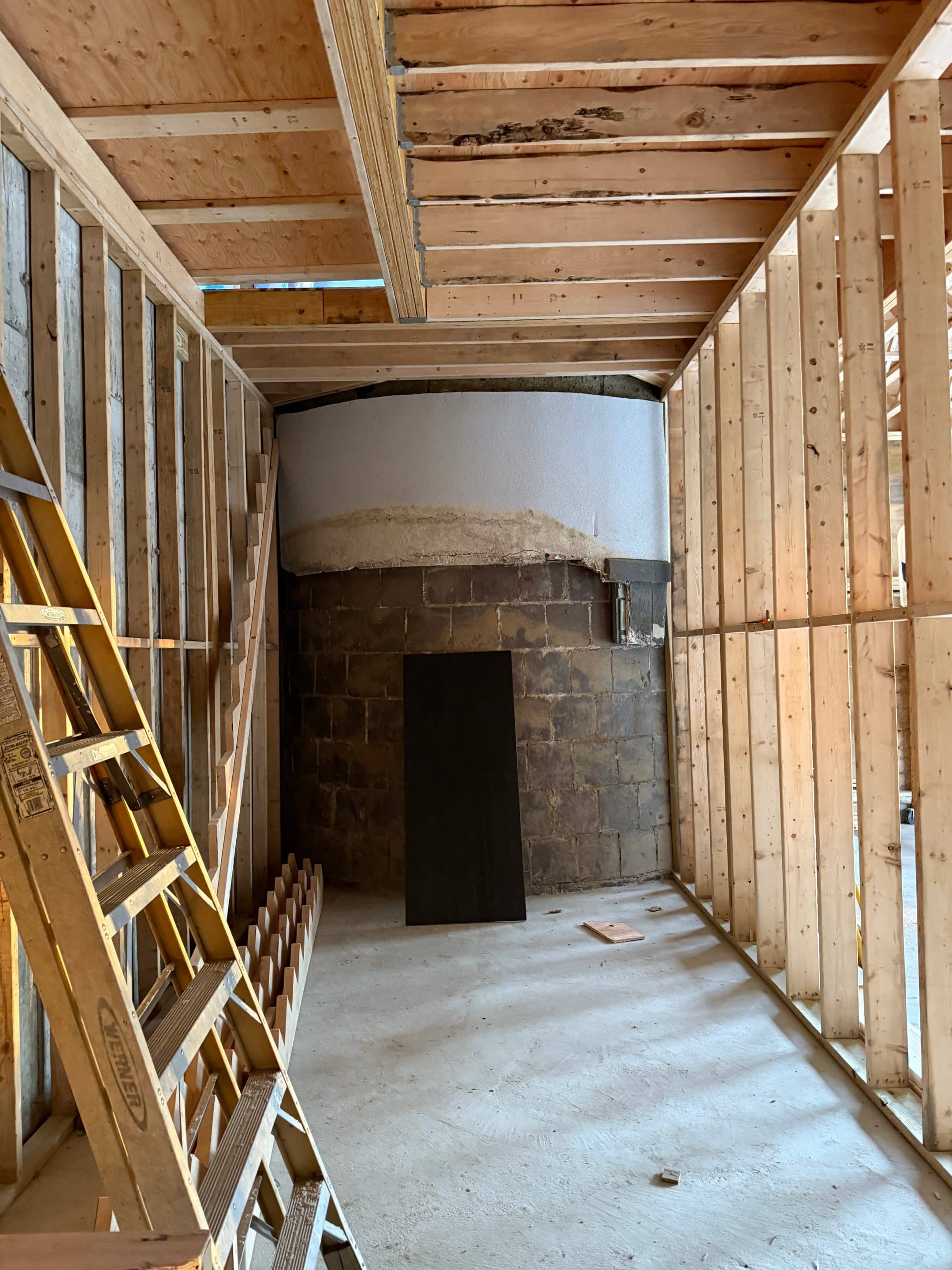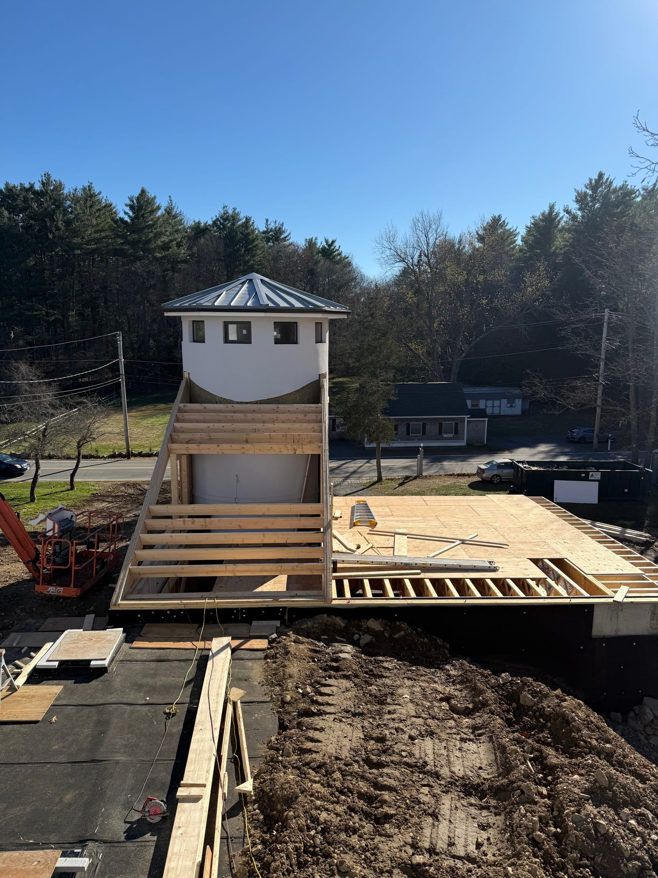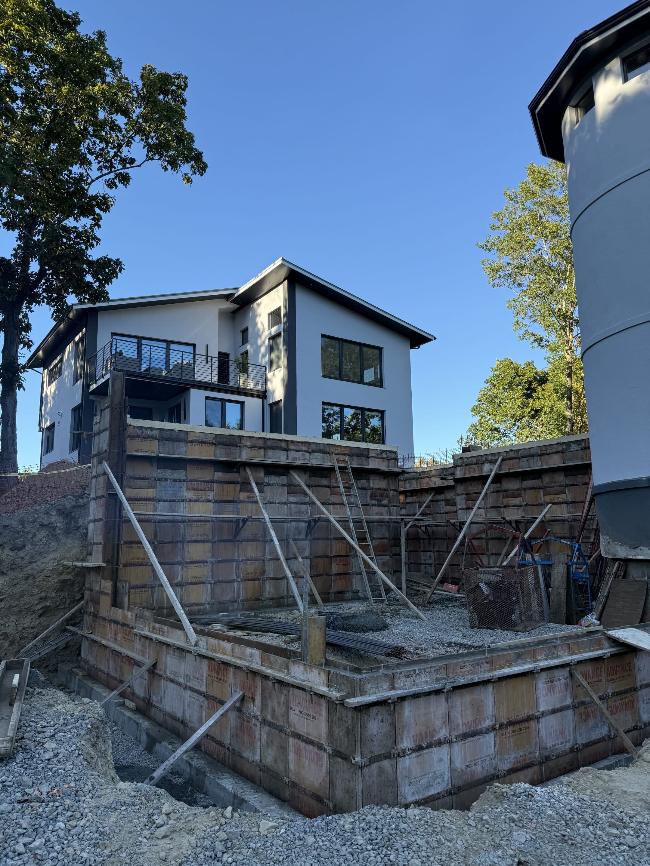 Designing and constructing the tunnel presented unique challenges due to the steep hill at the front of the property. Excavating the slope required precision to ensure stability while creating enough space for the tunnel, bathroom, and garage. An excavation team was hired to carefully dig into the hill, after which the foundation was poured and the framing completed. The project has now moved into the waterproofing phase on the tunnel roof to ensure long term durability.