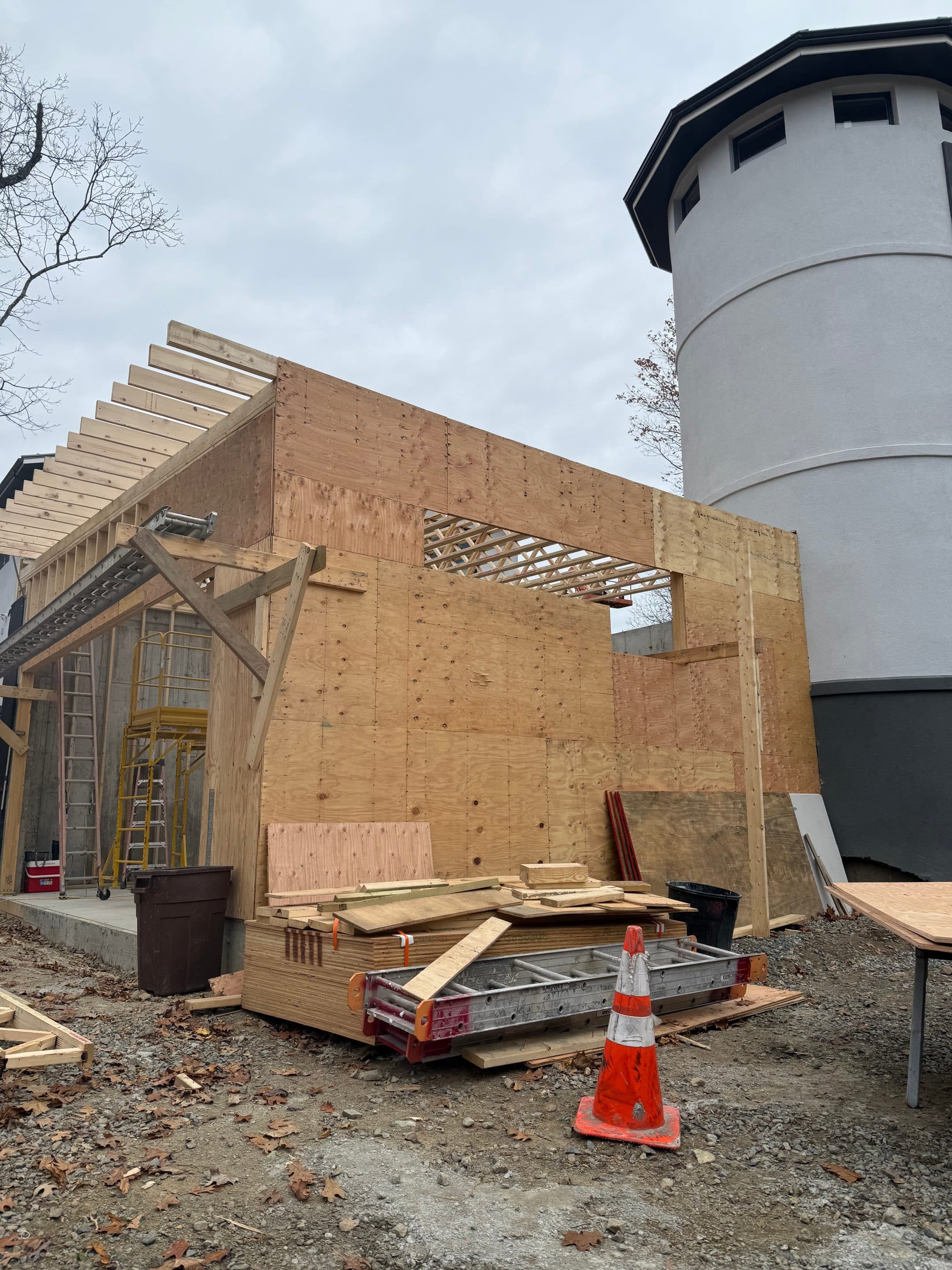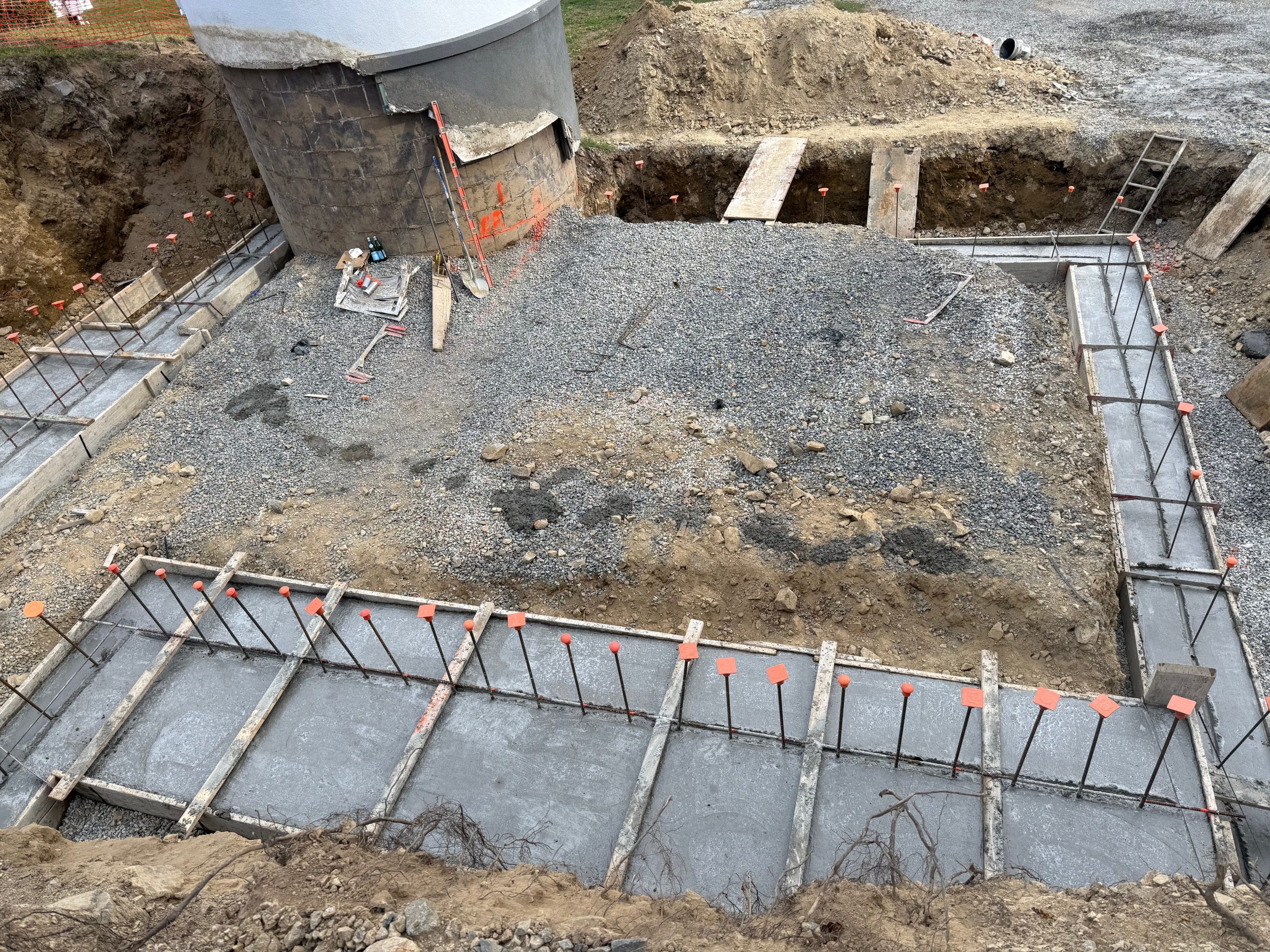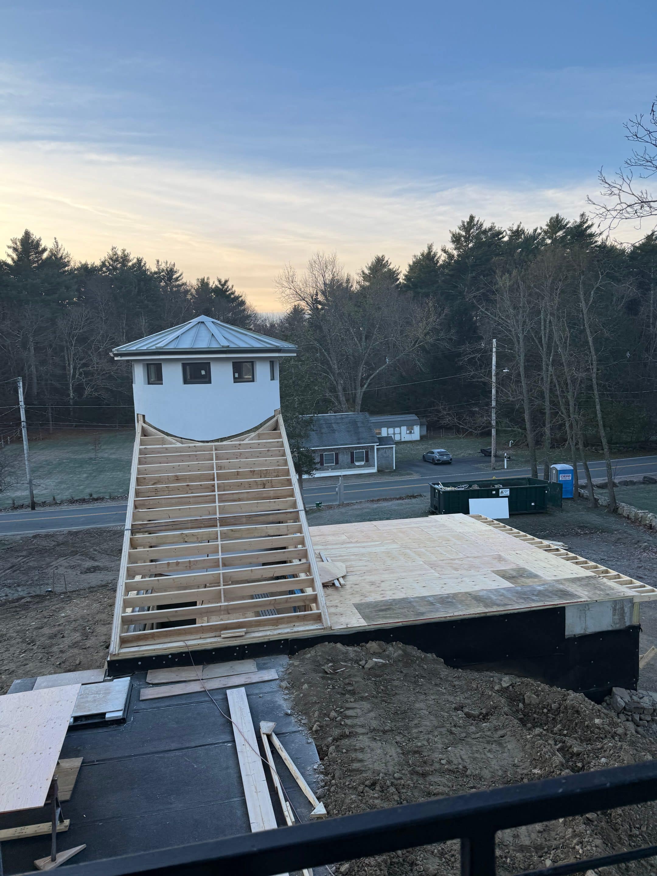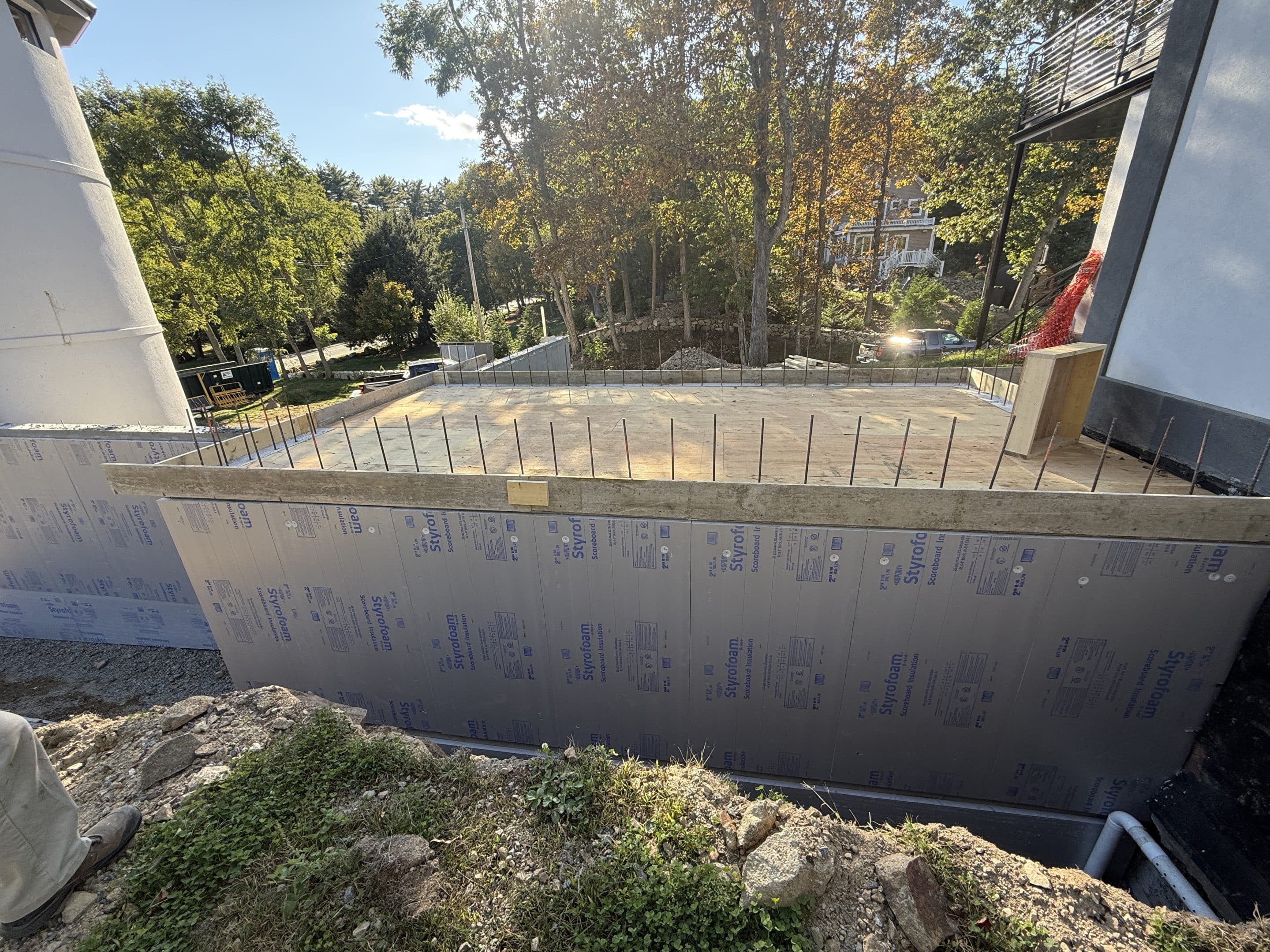 Designing and constructing the tunnel presented unique challenges due to the steep hill at the front of the property. Excavating the slope required precision to ensure stability while creating enough space for the tunnel, bathroom, and garage. An excavation team was hired to carefully dig into the hill, after which the foundation was poured and the framing completed. The project has now moved into the waterproofing phase on the tunnel roof to ensure long term durability.