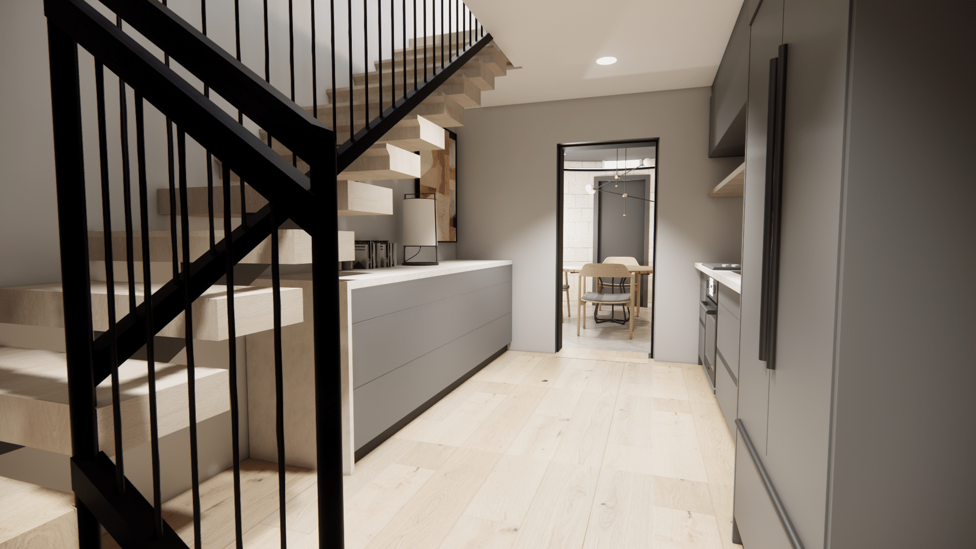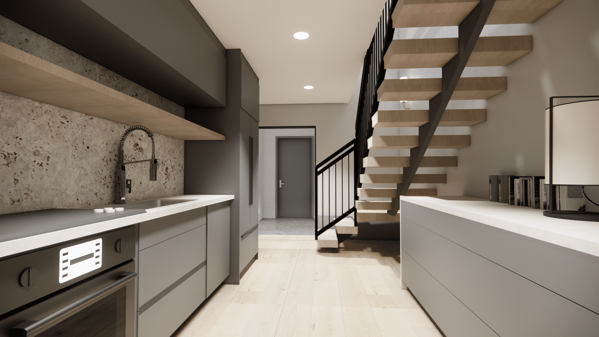 Kitchenette and stairwell to upper floor in silo
