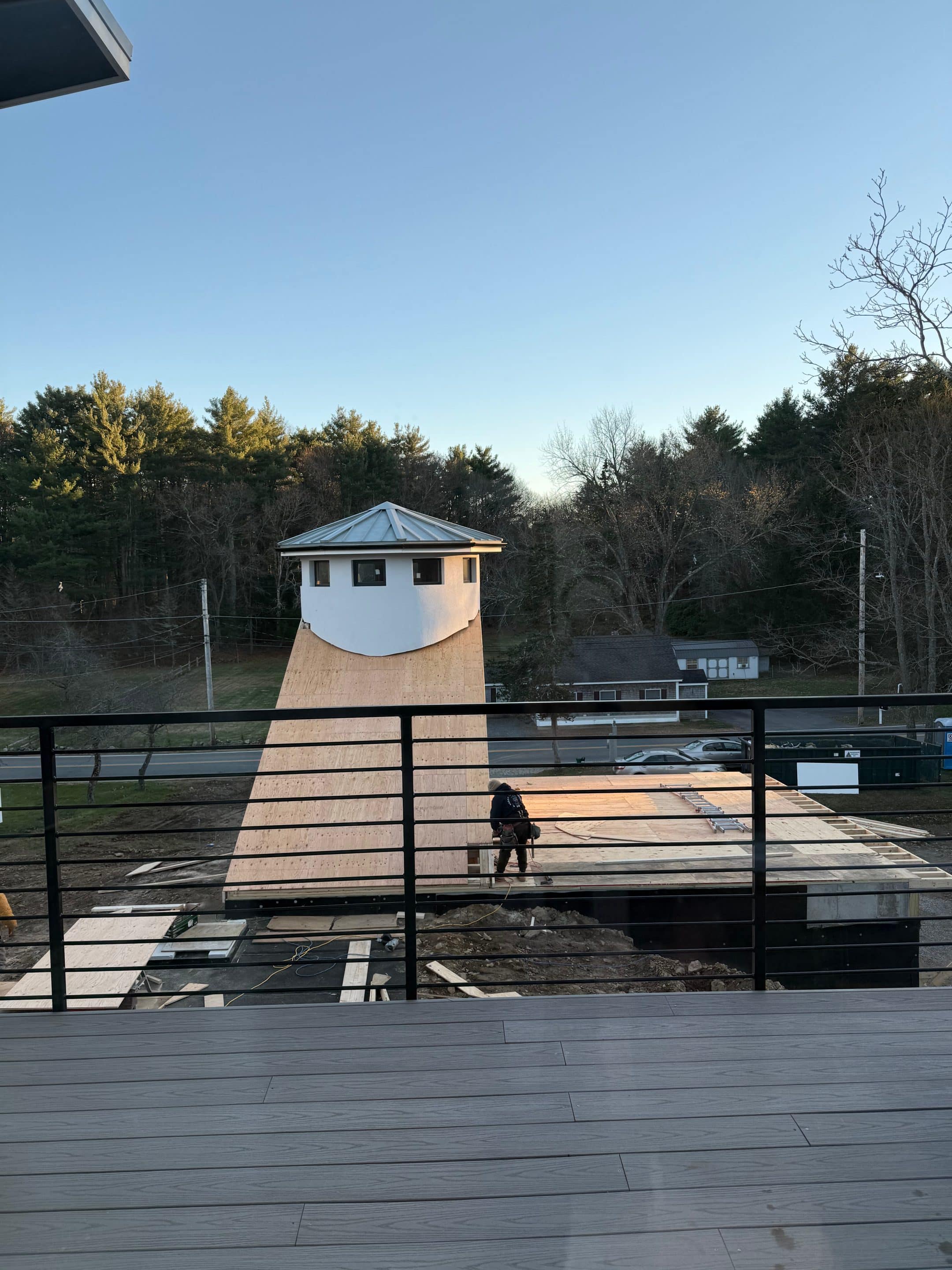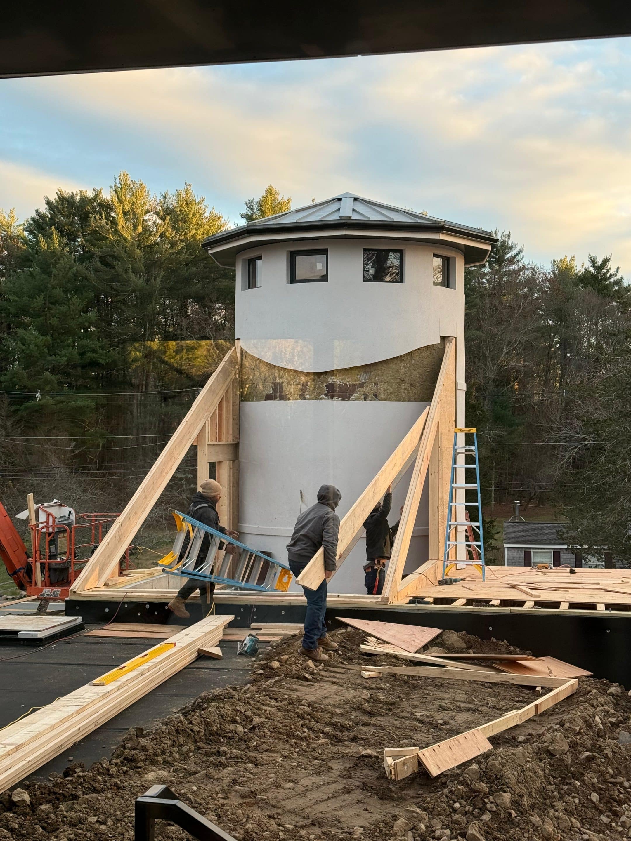A signature element of the net zero home in Ipswich, Massachusetts is the tunnel that connects the main residence to the soon-to-be renovated silo. Originally envisioned as a home office, the silo has now been reimagined into a flexible living space with multiple functions. Upon entering the silo, you will step into a room that can serve as a dining area or bedroom. Moving deeper inside, a kitchenette will provide convenience, while a stairwell will lead to an additional floor above.